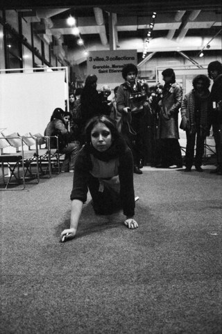 This particular event took place at the Centre George Pompidou in Paris in 1976, year the Centre opened. As the documentation indicates, the action took place on December 2, beginning at 5:15 p.m. and ending around 6:00 p.m. ORLAN set her easel on the mezzanine overlooking the forum and then headed to the upper floors to continue her action in the rooms of the Musée National d’Art Moderne, then featuring an exhibition on public collections of the modern art in France, specifically devoted to three cities and three collections: Grenoble, Marseille, and Saint-Etienne. The place and date of this MeasuRAGE were therefore doubly strategic.